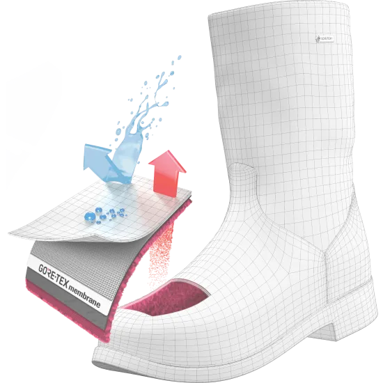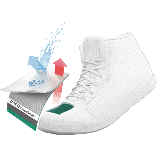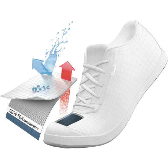 GORE-TEX鞋类具有优异的透气性,即使在剧烈活动下,都能保持您的双脚舒适。水滴无法进入,但汗气却可经由GORE-TEX薄膜上的微孔排出。